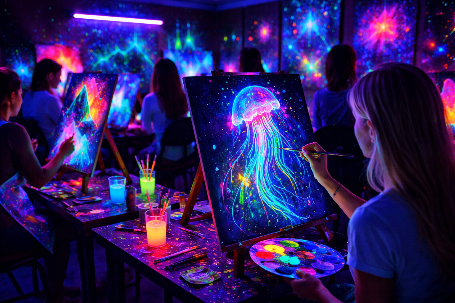 Malen im Schwarzlicht! Ein unvergesslicher, kreativer Abend mit leuchtenden Neonfarben auf Leinwand